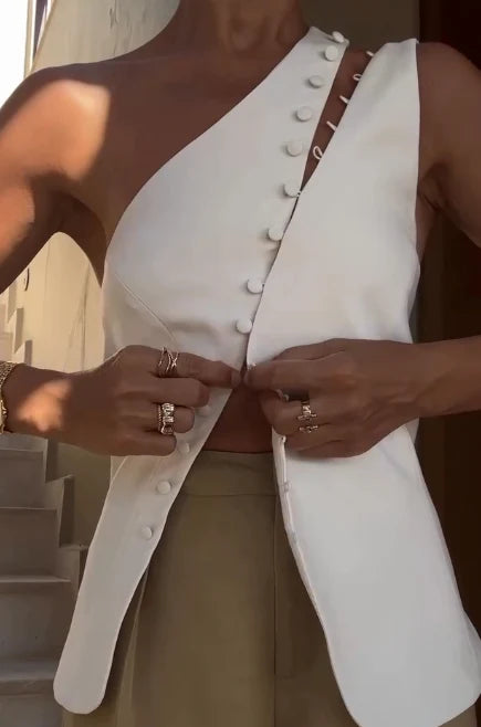 Elevate your wardrobe with the Elysian Asymmetrical Off-Shoulder Vest. Crafted for the modern woman, this vest combines chic design with versatile wearability, making it the perfect addition to any occasion.